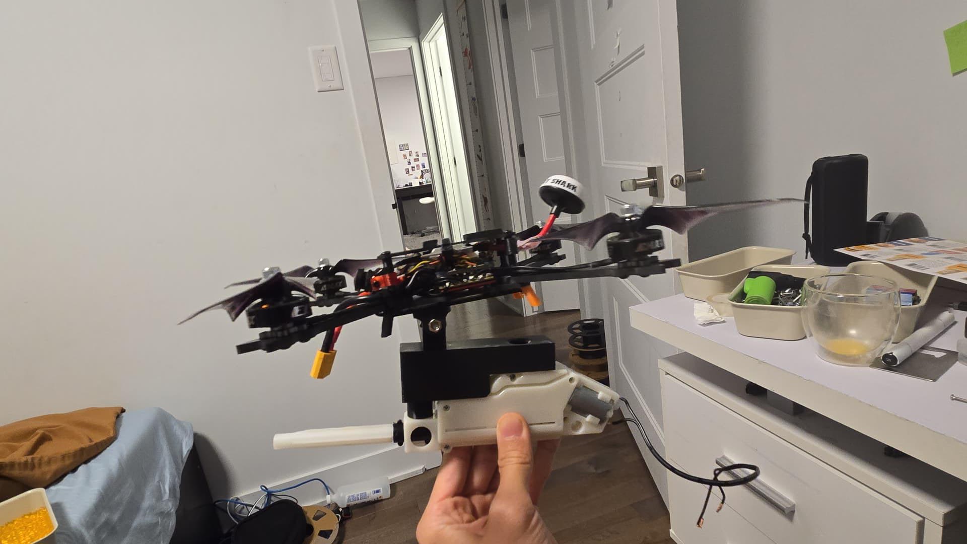 The project objective was the tactical modification of a 6-inch analog FPV multirotor to support a remotely actuated kinetic projectile system (gel blaster). The platform serves as a study in payload integration and real-time kinetic target acquisition via analog FPV optics.