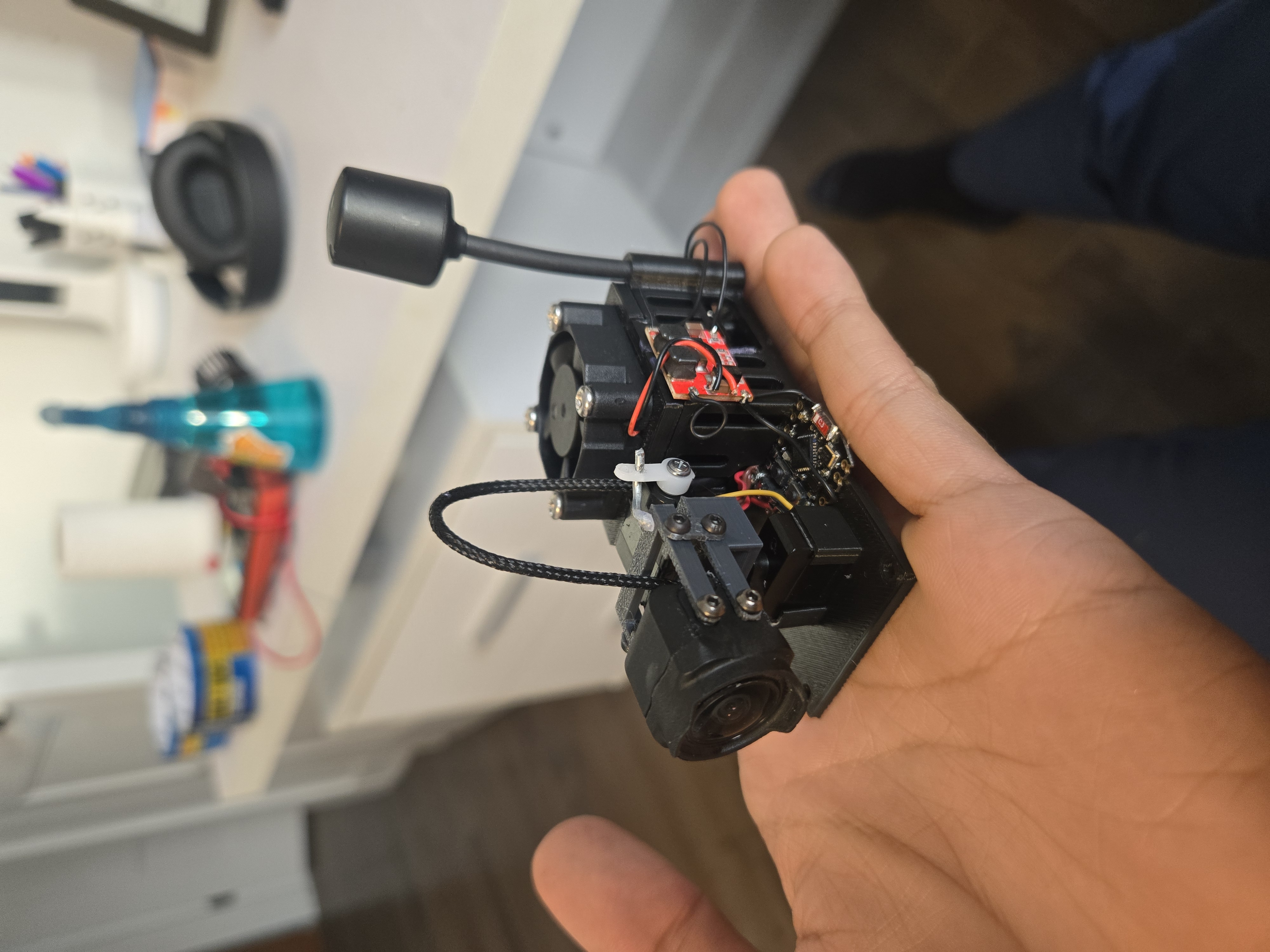 A 2-axis head-tracking gimbal system built for the DJI Goggles 3 and O3 Air Unit. Two ESP32-C3s communicate over ESP-NOW — one on the goggles reading head orientation, one on the drone driving the servos.