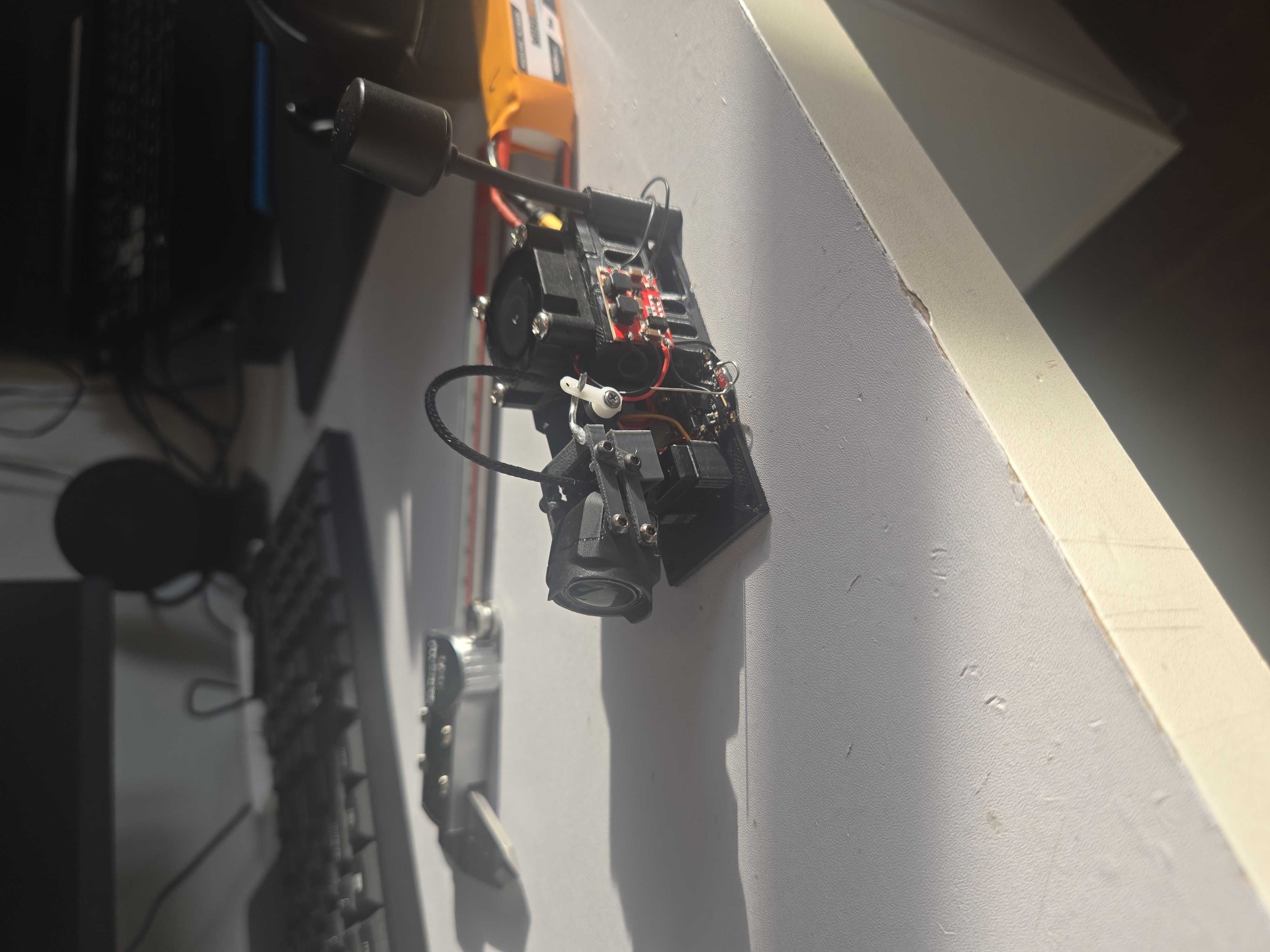The gimbal assembly is custom-designed and FDM-printed, housing two micro-servos for pan and tilt. A buck regulator accepts 2S–6S battery input so it runs off whatever is powering the aircraft.