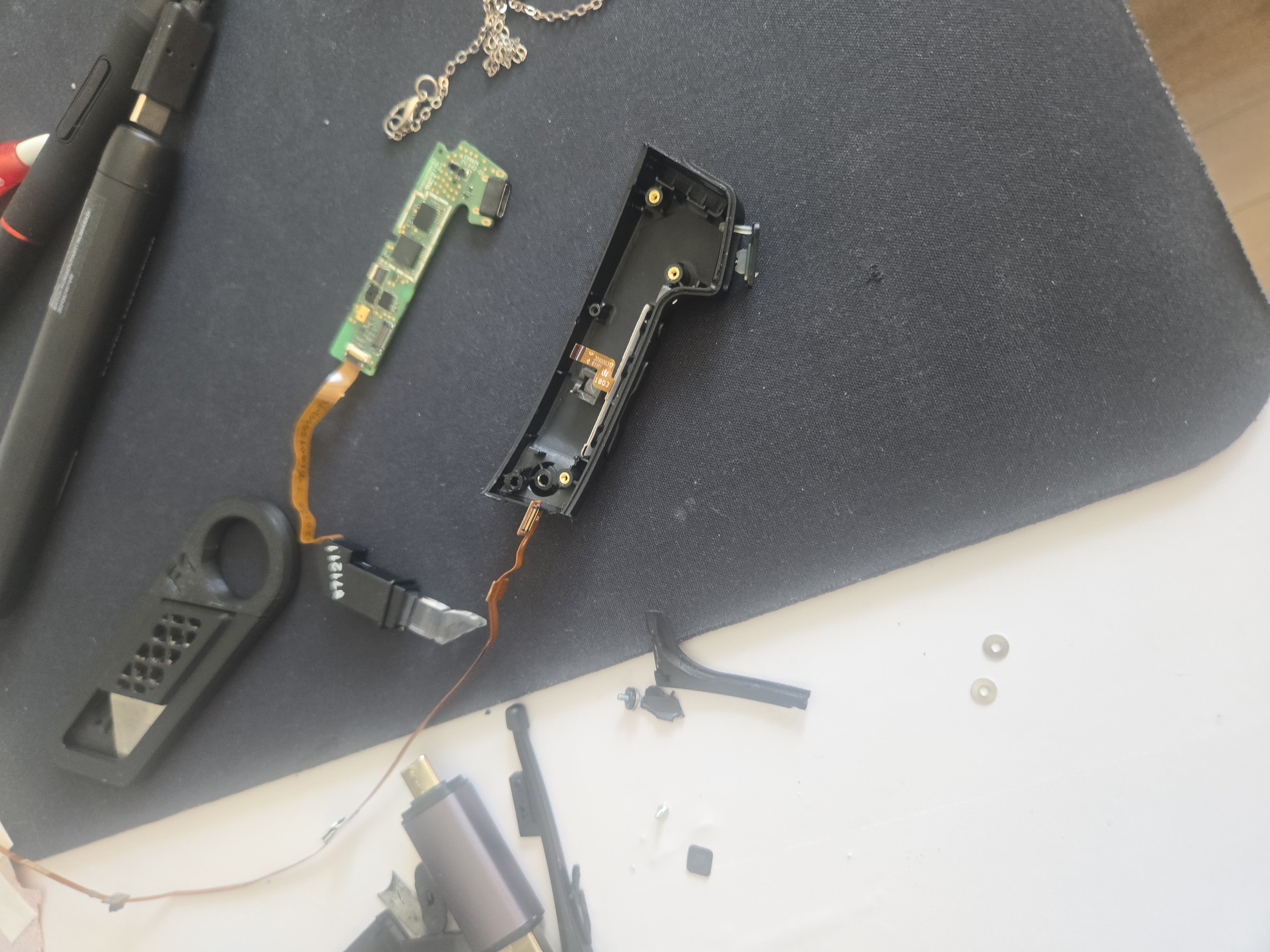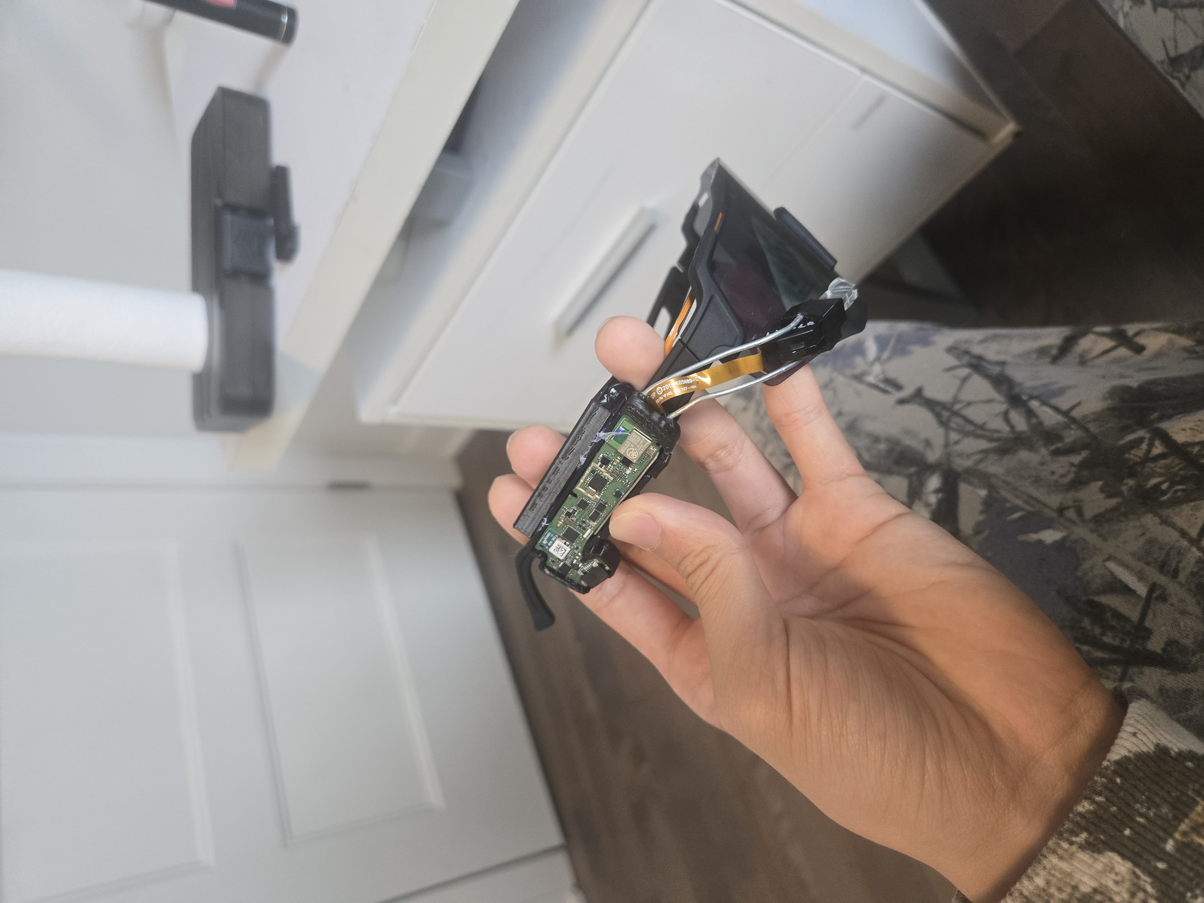 To achieve the desired form factor, drastic modifications to the internal routing were required. The main flex cable bridging the left and right temples was manually severed to halve its length. This was executed under microscopic magnification using precision clippers to ensure the internal traces of the multi-layer flex PCB were not short-circuited during the cut. The raw edge of the severed flex was subsequently sealed with UV resin to prevent delamination or environmental ingress.