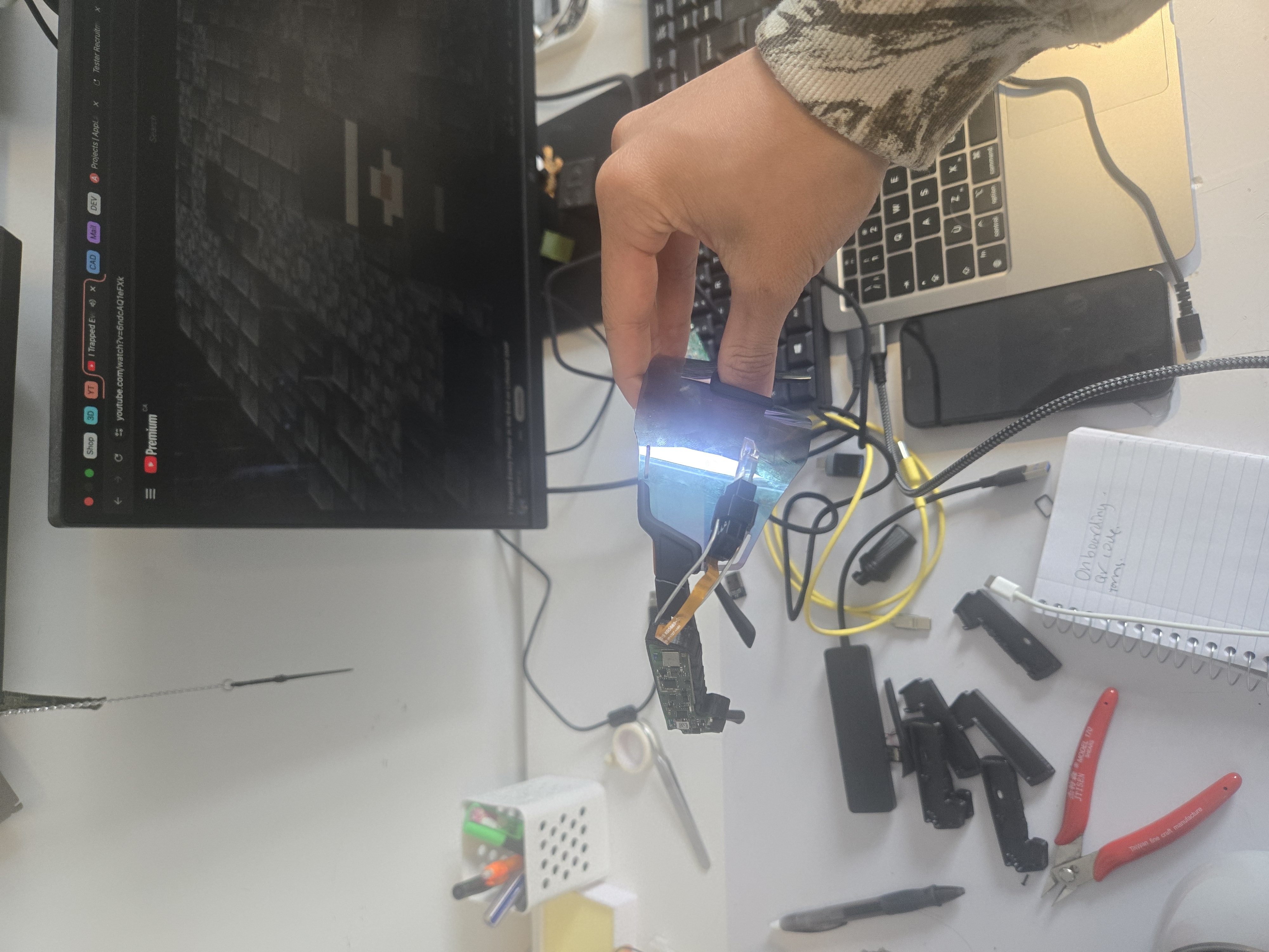 The secondary objective was the radical reduction of the platform's volumetric footprint. The OEM injection-molded housing was decommissioned, and the internal components—including the main logic PCB, flex assemblies, and the optical waveguide prism—were extracted.