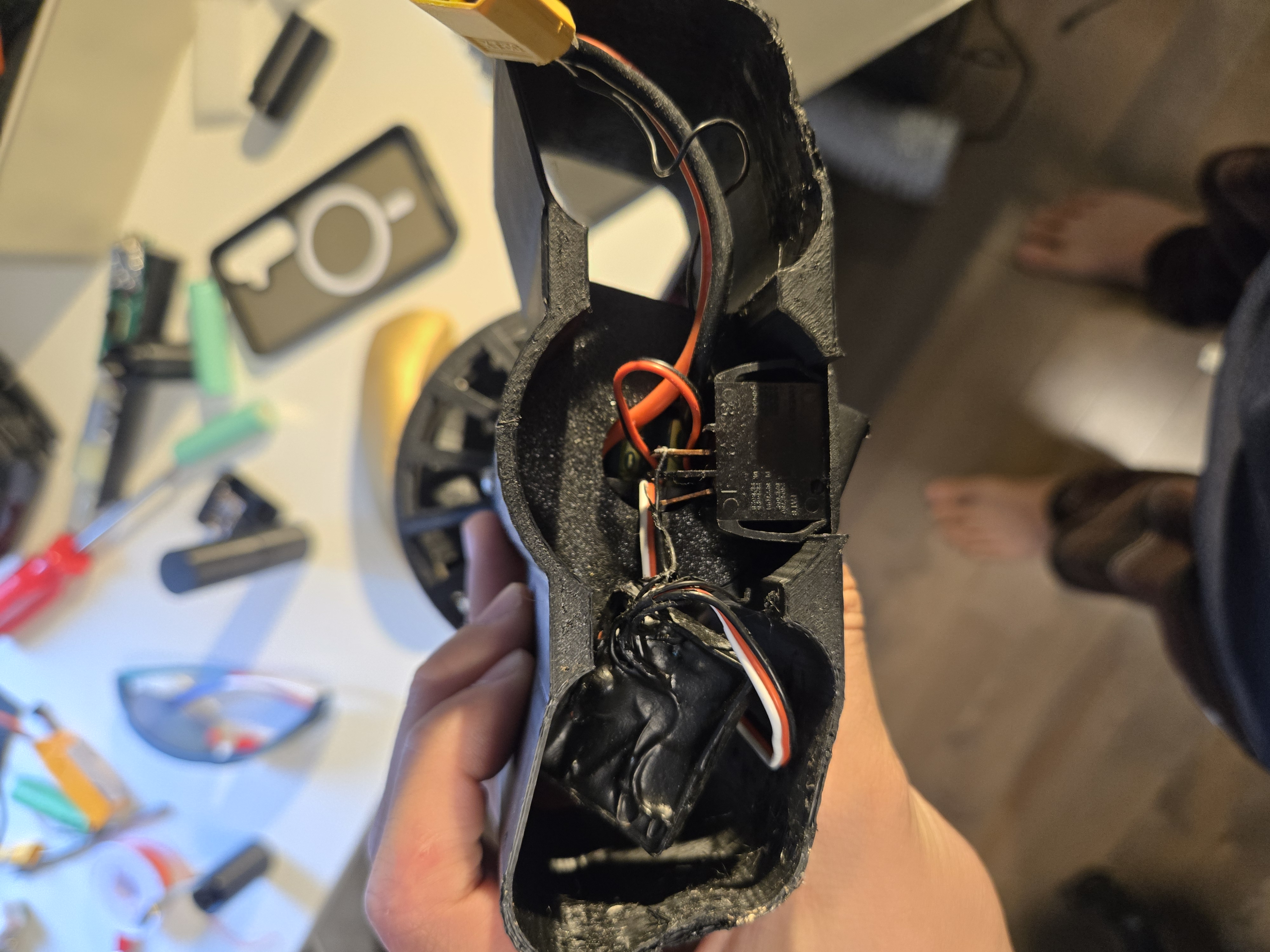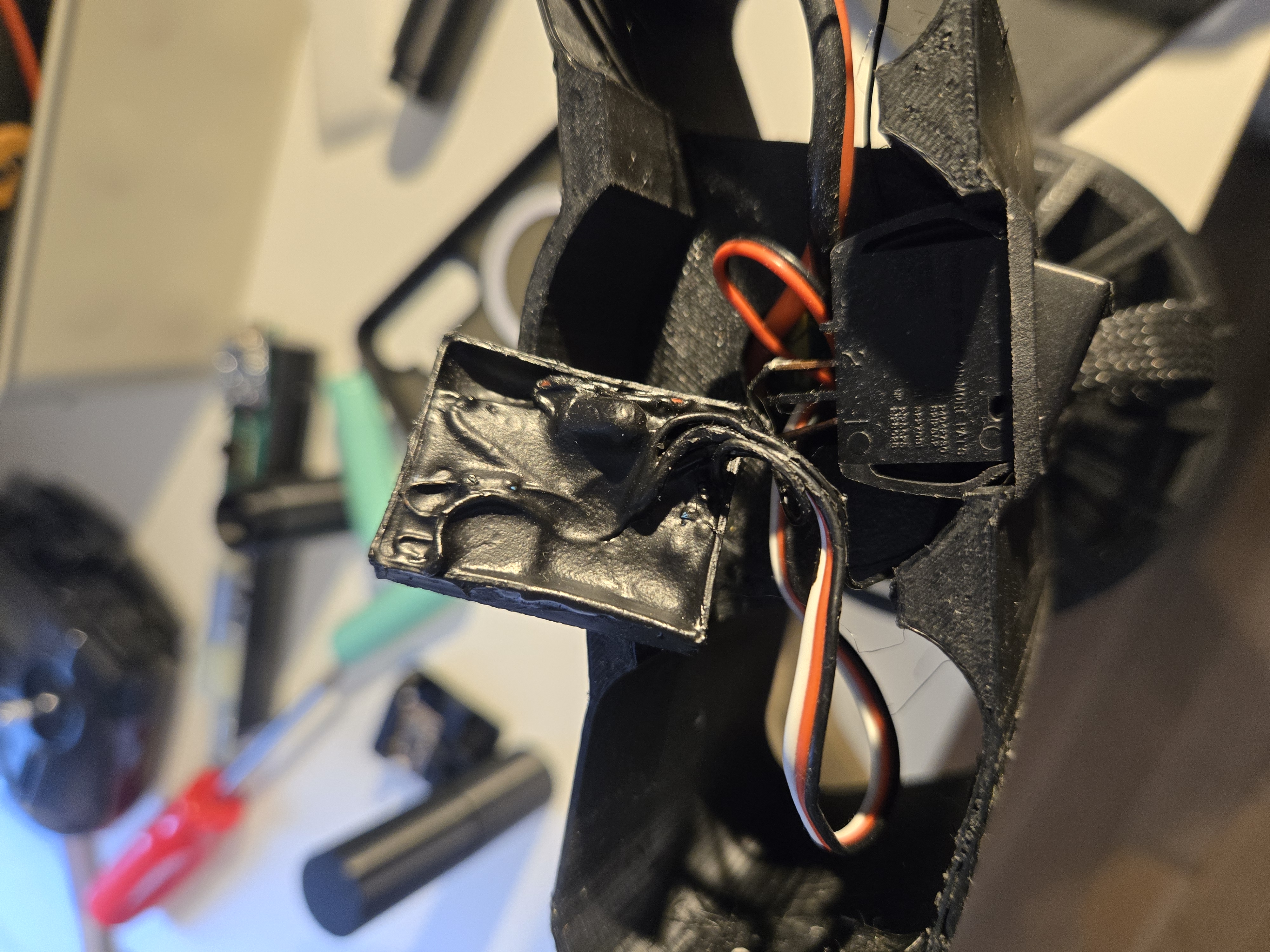Holding the button at boot skips ESC arming and enters OTA (Over-The-Air) mode, indicated by a pulsing blue LED. This was a mandatory engineering requirement, not a convenience feature: because the ESP32 is permanently potted in liquid electrical tape, there is zero physical access to the debug or serial ports. Architecting a wireless fail-safe was the only way to ensure the hardware wouldn't become a "brick" the moment a software edge case was discovered.