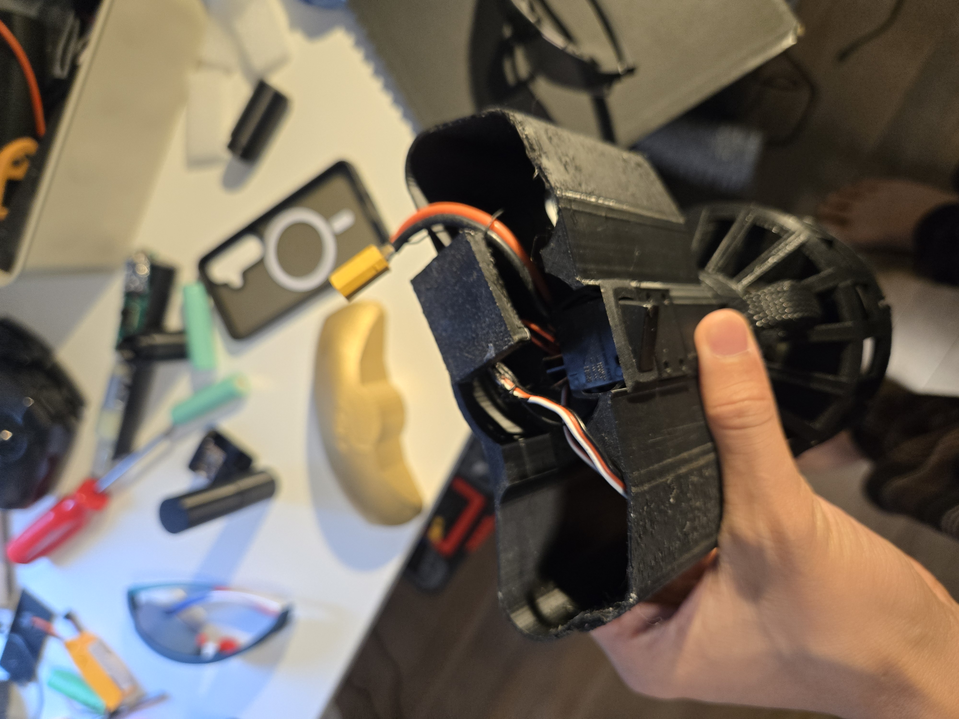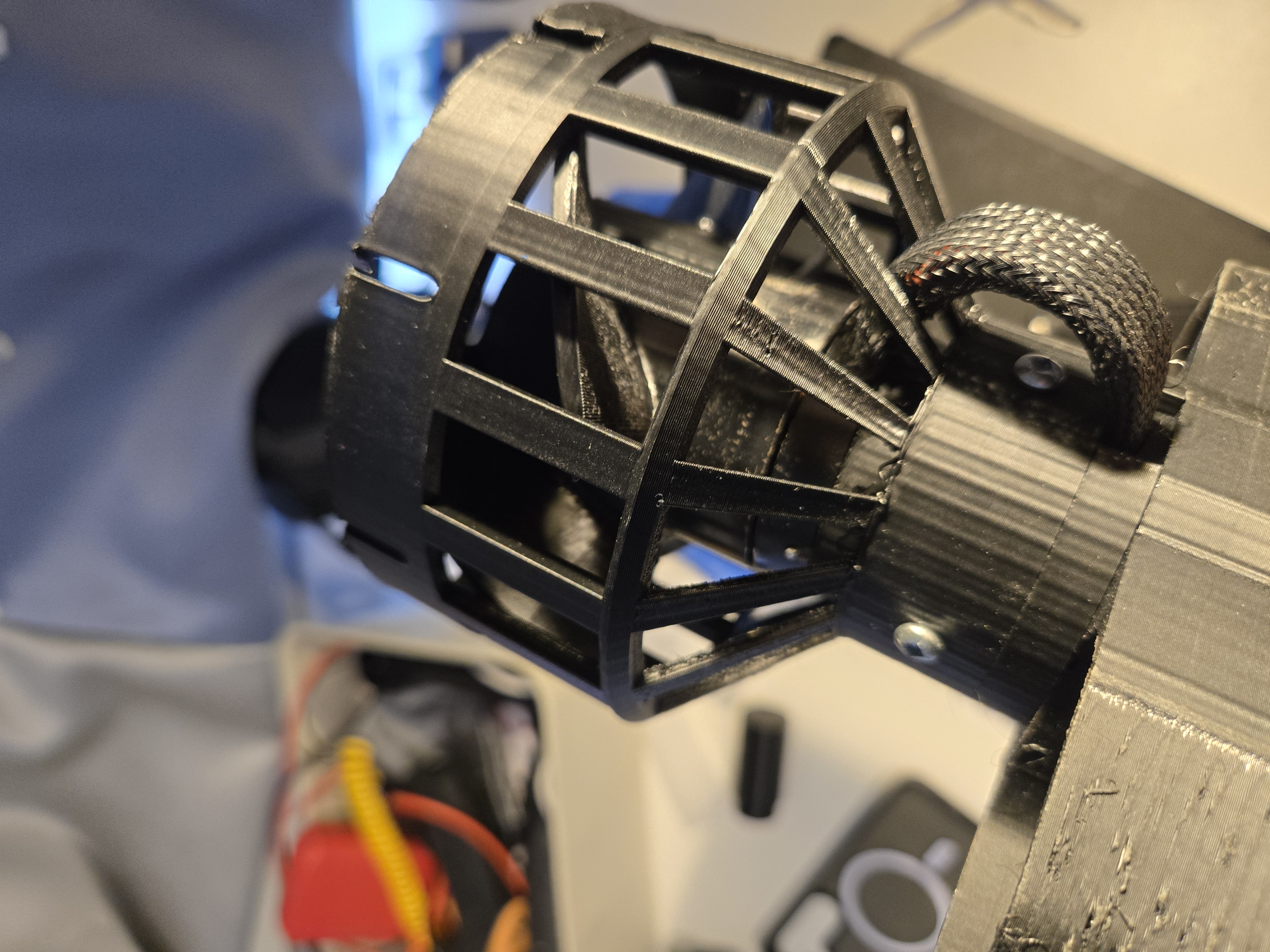 The chassis is PLA, designed in CAD and printed on an Ender 3. Getting everything to fit took many revisions — the brushless motor is physically larger than the brushed units in v1, and the waterproof ESC adds volume that had to be routed carefully. The final design is compact and holds together well.